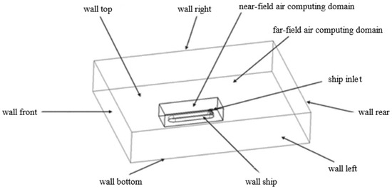 In this study, the external flow field calculation domain adopts a length of 600 m (4 times the length of the ship), a width of 400 m (20 times the width of the ship) and a height of 150 m (10 times the height of the ship). The fluid computational domain is divided into near-field computational domain and far-field computational domain. A rectangular area of 20 m around the ship is selected as the near-field watershed, and the rest of the area is the far-field area. The computational domain and the ship model use Boolean operations to remove the solid part of the ship, leaving only the air computational domain and treating the ship wall and water surface as rigid surfaces. The divided computational domain is shown in Figure 5.