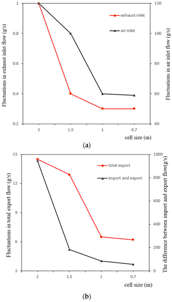 In terms of the selection of cell size, this section verifies that the cell size is 2 m, 1.5 m, 1 m and 0.7 m, which decreases successively. The calculation requires the setup of exhaust inlet mass flow monitoring, air inlet mass flow monitoring and outlet mass flow monitoring. The converged data were analyzed to verify the fluctuation of import and export flow and the flow difference. The trend of the above two parameters with the refinement of cell size is shown in Figure 7.