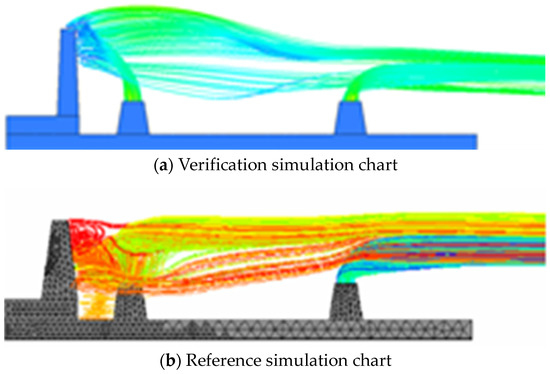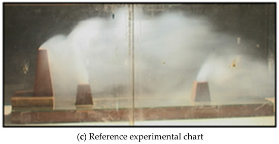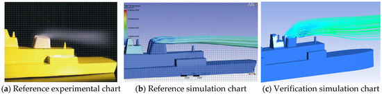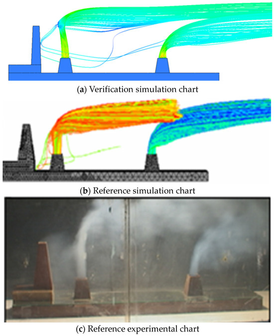 The author of this paper provides detailed simulation model size parameters, as shown in Figure 10, which enables better simulation reproduction. The case selected in this study is a simplified model of a ship with dual exhaust gas, in which a mast is in front of the exhaust pipe of a ship on the front side, which affects the exhaust gas diffusion. The results are shown in Figure 11 and Figure 12. As can be seen from Figure 11a, when the velocity ratio K is equal to 1, the low-pressure area generated behind the mast causes the exhaust gas to wash the mast after discharging from the front chimney and then impact and spread. The exhaust gas diffuses over a large area at a height higher than the horizontal line of the mast, flows backward, converges with the rear exhaust gas and diffuses backward together. In the simulation results of the paper, although the exhaust gas from the front chimney appeared to wash towards the mast, it can be seen from the streamline in the figure that only a small portion of the exhaust gas was at the edge, and most of the exhaust gas still diffused towards the rear. The exhaust did not diffuse to the area higher than the mast, resulting in significant differences in simulation results. By observing the experimental phenomenon, it can be seen that the simulation results in this study have a higher degree of agreement, and their streamlined trajectory is consistent with the diffusion law of exhaust gas in the experiment. Therefore, the credibility of the results in this study is relatively high.