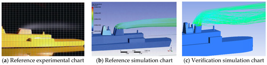 The first paper selected for this verification is titled “Numerical Modeling of Exhaust Smoke Dispersion for a Generic Frigate and Comparisons with Experiments” by Ergin et al. [44] from Istanbul Technical University. The paper focuses on exhaust diffusion from a general-purpose frigate. The speed ratio (exhaust gas speed/synthetic wind speed) K in this study is about 0.6, so two cases with a speed ratio K of 0.407 and 0.815 in the paper are selected for comparison, which is not significantly different from the speed ratio in this study. Their simulation comparison is shown in Figure 8 and Figure 9.