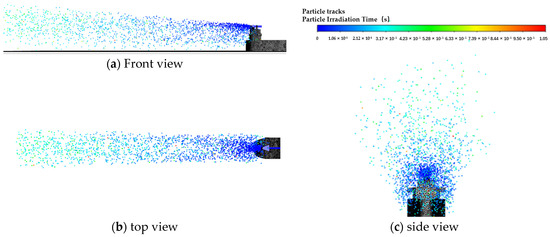 According to the particle tracking diagram in Figure 13, after the particles are discharged from the chimney, most of the particles directly diffuse to the rear along with the external flow field, while a small number of particles still remain at the stern of the ship for a long time and then diffuse to the rear. According to the analysis, the reason for this phenomenon is that the air will form eddy currents at the back side of the ship when it flows through the outer surface of the ship. Some of the particles are caught in the vortex during the diffusion process, resulting in a longer period of stagnation. The particles will rotate with the vortex for a long time.