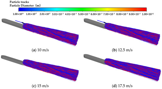 It can be seen from Figure 14 that with the increase in velocity, the overall diffusion mode and range of PM do not change greatly. But at the stern of the ship, it can be seen that as the wind speed increases, the range of particle diffusion partially increases. The reason for this phenomenon is that when the wind speed increases, the vortex area generated by the stern is larger in volume and has more turbulent kinetic energy. Therefore, when particles are sucked into the vortex, their range of motion is larger.