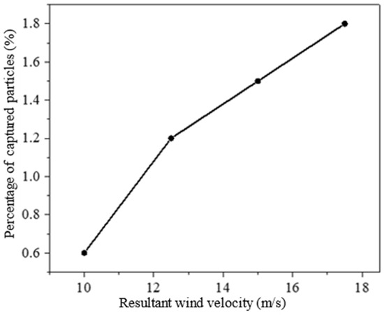 As can be seen from Figure 15, the particle capture rate increases with the increase in synthetic speed. Among them, the speed increases the fastest in the range of 10 m/s to 12.5 m/s, followed by a slow decline. However, the overall particle capture rate (number of captured particles/number of tracked particles) changes little. Through analysis, it can be seen that within the range of 10 m/s to 12.5 m/s, it is near the critical value of the external flow field for exhaust gas diffusion. Therefore, as the velocity increases, the chaos degree of the exhaust diffusion increases considerably so that the particle capture rate rises rapidly in this interval and then slowly decreases. Therefore, it can be concluded that when the stability of the external flow field is worse, the number of particles captured by the ice surface is higher. In order to reduce the impact of PM on Arctic ice melting, ships should try to navigate in an environment with lower synthetic wind speed.