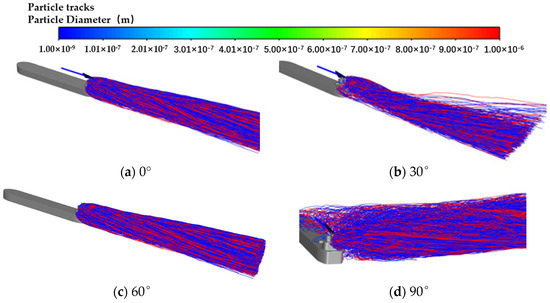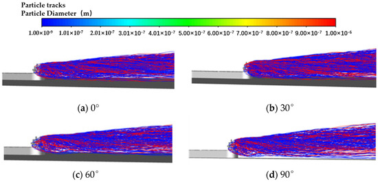It can be seen from Figure 16 that with the increase in the angle, the diffusion trajectory of PM is gradually confused. When deflection occurs, the main diffusion region of PM shows a downward trend. When the yaw angle reaches 90°, due to the large blocking effect on the incoming flow caused by both the hull and the ship building, some particles diffuse along the airflow to the side of the hull, and some particles diffuse above the deck. The density of the streamlines shows that only a portion of the PM diffuses with the airflow to the bow and deck, while most of the PM diffuses towards the direction of the airflow as soon as it excludes the chimney.