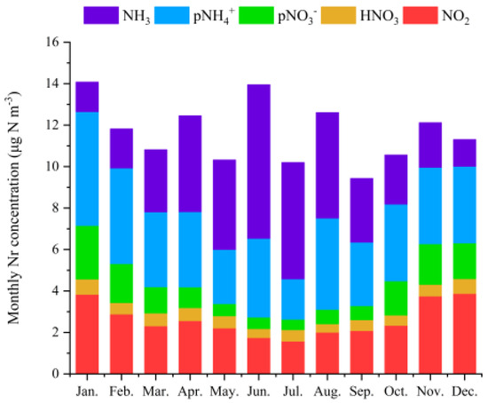 Mean monthly distribution of mean atmospheric Nr concentrations for the period 2011−2020.