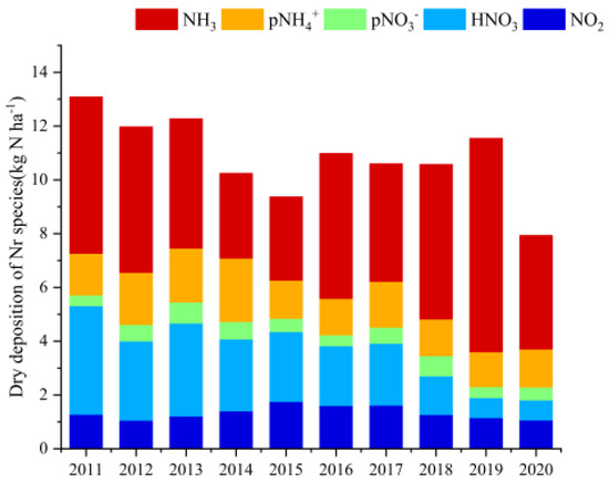 The annual mean deposition of gaseous NH3, HNO3, and NO2 and particulate pNH4+ and pNO3− was in the ranges of 3.10–7.93, 0.74–4.04, 1.06–1.75, 1.30–2.36, and 0.40–0.78 kg N ha−1, respectively, over the 10 years. The annual mean deposition of NO2 and HNO3 and particulate pNH4+ and pNO3− was of 5.00 ± 1.35, 1.34 ± 0.23, 2.32 ± 1.03, 1.64 ± 0.34, and 0.56 ± 0.13 kg N ha−1, respectively. The annual total dry deposition of Nr during the 10-year period at this sampling site varied from 6.96 to 13.1 kg N ha−1 and the mean value was of 10.5 ± 1.83 kg N ha−1 (Figure 4). The analysis of interannual variation showed that the total dry deposition of Nr decreased, with an average decrease of 39.4% by 2020 compared to 2011 (Figure 4).