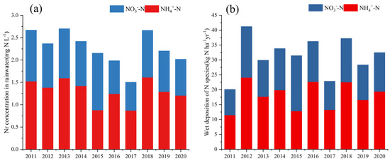 Precipitation is generally high at this typical site in in southern China. Annual precipitation varied from 753 to 1608 mm over the 10-year period, with a mean value of 1410 ± 296 mm (Table 1). The annual mean concentrations of NH4+-N and NO3−-N in precipitation were mainly in the ranges of 0.88–1.61 and 0.63–1.27 mg N L−1, and their mean values were 1.30 ± 0.25, and 0.97 ± 1.85 mg N L−1, respectively (Figure 5a). NH4+-N dominated but declined: despite some fluctuations, the NH4+-N concentration in precipitation in 2020 was 21.0% lower than that in 2011. The annual mean concentration of NO3−-N also decreased by 28.8% in 2020 compared to 2011.