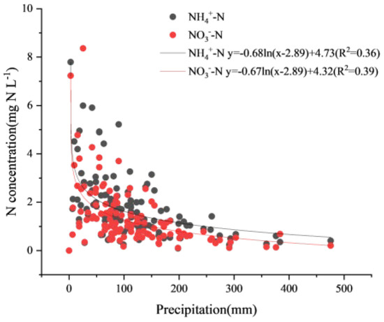 The annual mean wet/bulk deposition of NH4+-N, NO3—N, and total inorganic N was in the ranges of 11.50–24.10, 8.61–18.61, and 20.11–37.24 kg N ha−1, respectively, with average values of 18.04 ± 4.2, 13.33 ± 2.90, and 31.37 kg N ha−1, respectively (Figure 5b). The annual mean total wet/bulk deposition peaked in 2012 and declined gradually during the 10-year sampling period (without a statistically significant decreasing trend) (Figure 5b). Combining the analysis of reduced and oxidized N, NH4+-N and NO3−-N accounted for 58% and 42% of the wet/bulk deposition, respectively, suggesting that the former dominated. The correlation between precipitation and atmospheric inorganic N (NH4+-N and NO3−-N) concentrations, as important components of wet/bulk N deposition, was investigated. We found a negative logarithmic relationship between monthly mean inorganic N concentrations and monthly precipitation over the 10-year period (Figure 6).