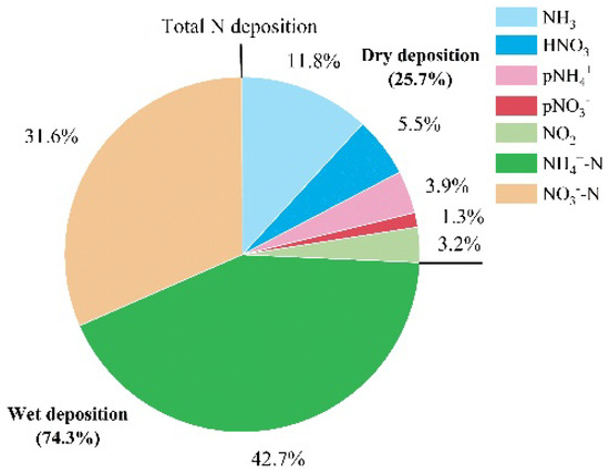 Atmospheric reactive nitrogen (Nr) emissions have been increasing every year, caused by rapid economic development and the increasing global population [1]. Anthropogenic activities are the main contributors to this increase in Nr deposition [2], with ammonia (NH3) and nitrogen oxides (NOx) being the main sources of nitrogen (N) emissions [3]. Although there are some urban sources from fossil fuel combustion [4,5,6], NH3 mainly originates from agricultural activities such as livestock farming and fertilizer application [7,8], while NOx is mainly derived from fossil fuel combustion such as industrial and traffic emissions [9]. Human-induced pollutant emissions dominate Nr emissions [10] and deposition [2], damaging the Earth’s ecosystems (e.g., reducing biodiversity) and triggering a series of ecological and environmental problems [11,12]. Therefore, reducing NH3 and NOx emissions is essential for reducing N deposition for realizing a green eco-environment [13]. In recent years, NOx (and sulfur dioxide (SO2)) emissions have been effectively controlled in China and in other countries, and so the focus on NH3 reduction has gradually increased [14]. Some research has reported long-term trends in wet/bulk and dry N deposition in north China [15,16], revealing different responses of N deposition to changes in Nr emissions. However, to date, no systematic studies have reported recent interannual changes in N deposition in the rural areas of southern China.