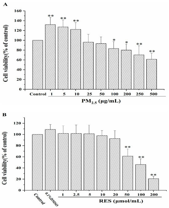 The effects of PM2.5 and RES on mHSCs cell viability. (A) The impact of PM2.5 at different concentrations on mHSCs viability. (B) The influence of RES at various concentrations on mHSCs viability (n = 4, compared with control group, * p < 0.05, ** p < 0.01).