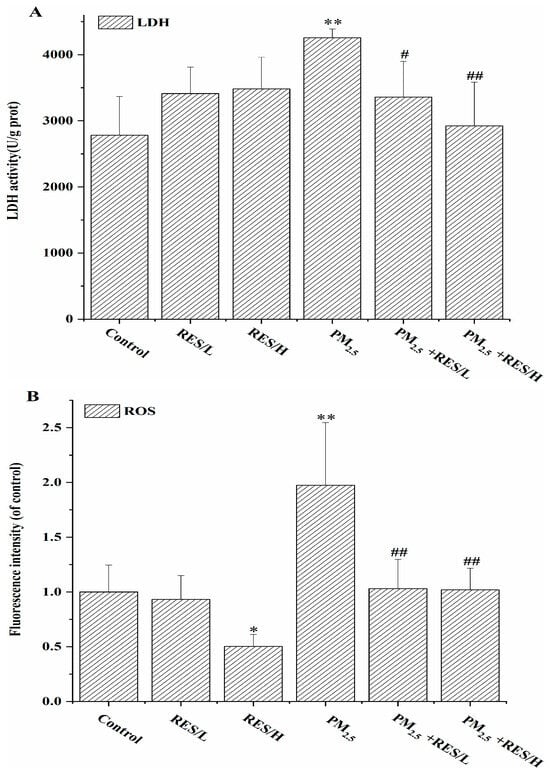 From Figure 2A, compared to the control group, the PM2.5 group showed a significant increase in cytoplasmic LDH activity (p < 0.01). Following RES intervention, there was a considerable reduction in cytoplasmic LDH release compared to the PM2.5 group, with higher concentrations of RES exhibiting a greater attenuation of PM2.5-induced LDH activity enhancement.