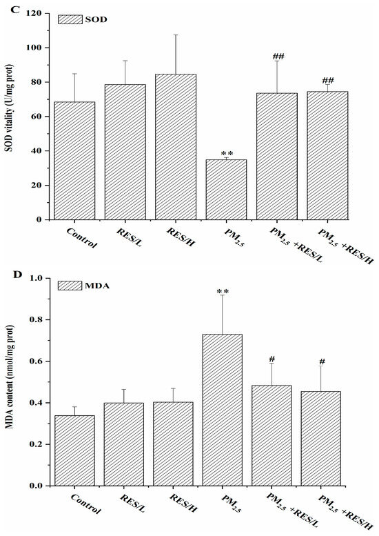 The effects of RES on PM2.5-induced alterations in cell LDH and oxidative stress. (A) LDH activity, (B) ROS levels, (C) SOD activity, (D) MDA content (n = 4, compared with the control group, * p < 0.05, ** p < 0.01; compared with PM2.5 group, # p < 0.05, ## p < 0.01).