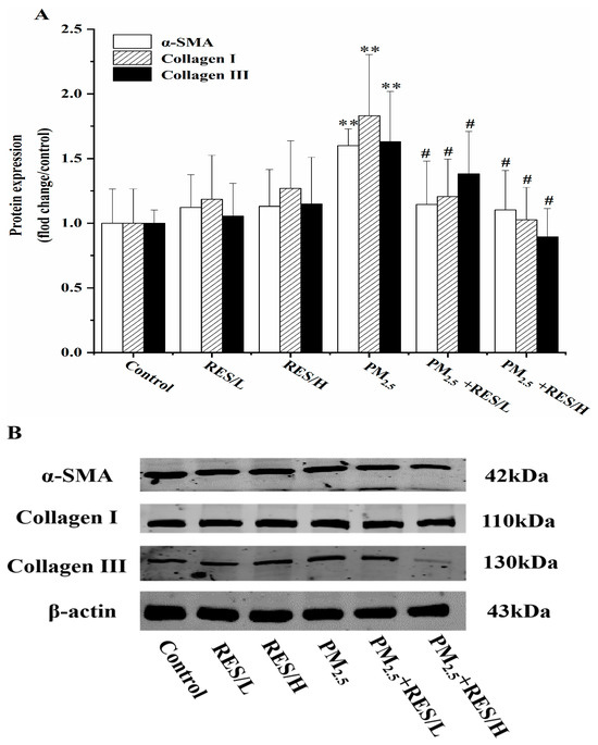 RES can inhibit PM2.5-induced fibrosis in mHSCs. (A) Protein expression (fold change/control) of fibrosis-related protein expression(/control) and (B) protein bands of α-SMA, Collagen I and Collagen III (n = 4, compared with the control group, ** p < 0.01; compared with PM2.5 group, # p < 0.05).