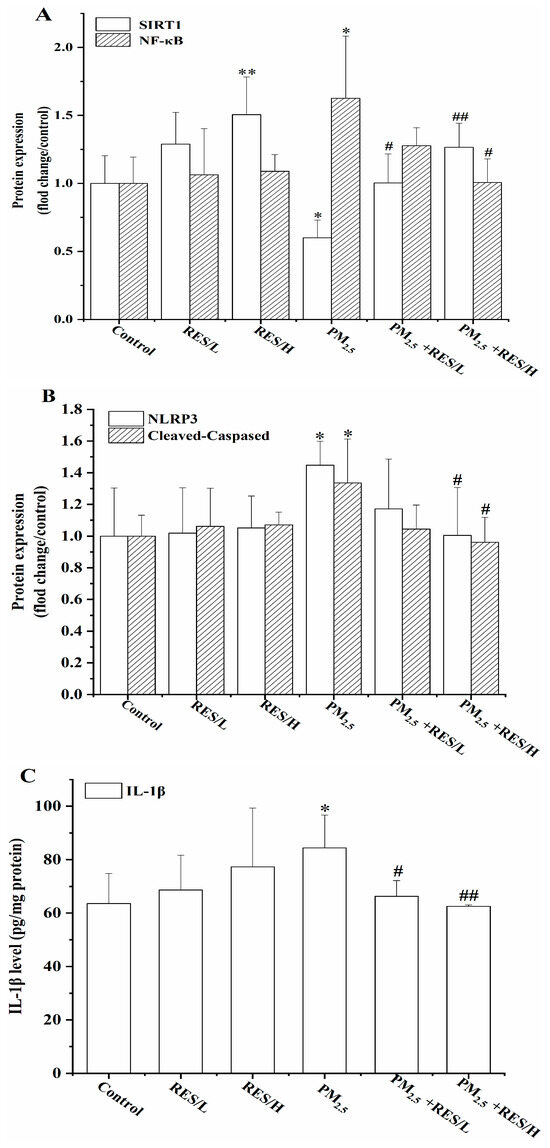 In a mHSC model, we proposed the possible mechanisms of RES-relieved liver fibrosis against PM2.5 through the SIRT1–NF-κB–NLRP3–Caspase1–IL-1β pathway. After exposure to PM2.5, ROS and MDA levels increased while SOD activity decreased in mHSCs. NF-κB, NLRP3, Caspase1 and IL-1β expressions were upregulated, whereas SIRT1 was downregulated. RES inhibited the SIRT1/NF-κB pathway, reducing oxidative stress and inflammation, and then regulated the NLRP3 pathway, decreasing the expression of fibrosis-related genes in mHSCs.
