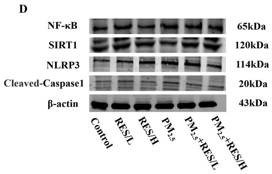 Figure 4 also shows that PM2.5 exposure leads to the upregulation of NF-κB, NLRP3, Cleaved-Caspase1 and IL-1β protein expression, significantly higher than the control group (p < 0.05). However, after RES intervention (20 µmol/mL), the expression of NF-κB, NLRP3 and Cleaved-Caspase1 significantly reduced in mHSCs relative to the PM2.5 group (p < 0.05 or p < 0.01). Two concentrations of RES treatment significantly decreased IL-1β protein expression in the cells compared with the PM2.5 group (p < 0.05 or p < 0.01).