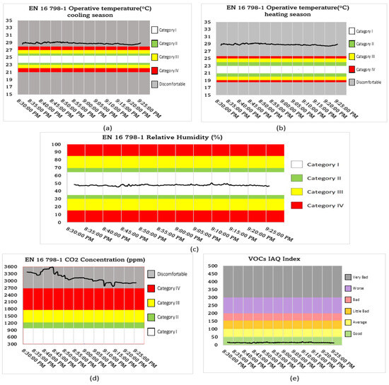 To summarize, the current study measured IC parameters, categorized them, and presented them in an adapted communication method using the requirements of the EN16798-1 standard. It has designated class schemes as suggested in the color code EN15251 [50] for indoor climate categories and indicated in the standard ISO 7730:2005. Furthermore, some implications regarding ventilation parameters, such as the fresh air flow rate (Q) and ACH (λ), were used to verify the IAQ in the studied LTCs, highlighting the potential risk to well-being, safety, and comfort with an emphasis on ensuring adequate IEQ in LTCs.