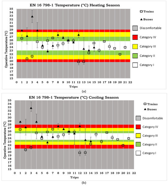 Figure 4 shows the results of the average operative temperature values of the recorded time series, categorized according to the EN 16798-1 requirement for each bus (15 trips) and train (21 trips). Figure 4a shows the categorization of all trips considering the heating season requirements of EN 16798-1, while Figure 4b shows the operative temperature categorization considering the cooling season requirements of EN 16798-1. Regarding buses, ten bus trips were investigated during the cooling season and five trips were assessed during the heating season as per the HVAC use for the summer and winter periods, respectively. According to EN 16798-1, the TO (°C) range for the comfortable categories varies between 21 °C and 28 °C in the cooling season for people with sedentary activity, this range being the limit of the four categories defined as represented in Figure 4. It can be verified that the average TO (°C) values of nine buses specifically were within categories I, II, and III, indicative of comfortable thermal environments in the cabins. Using the cooling season requirements (Figure 4a), in six of the bus trips (trips 1, 2, 3, 4, 8, and 12), the measured mean TO (°C) values were not in the comfort zone; significantly, the third trip was found in the category of discomfort at a mean TO (°C) of 32.8 °C. Using the heating season EN 16798-1 requirement (Figure 4b) to evaluate the mean TO (°C) level in the bus trips, three trips had inadequate thermal environments. Trips 1 and 4 were in category IV, while the third (bus trip 3) fell into the discomfort zone. Regarding the investigated train trips, using the cooling season EN 16798-1 requirement for the TO (°C) as in Figure 4a, five of the 21 trips were out of the recommended comfort range, with three in category IV and two in the discomfort zone. The mean TO (°C) values suggest that the thermal environment was colder than recommended. Using the heating season requirements as in Figure 4b, two trips showed poor thermal conditions at the boundary of category IV and discomfort, while another (trip 2), was between category IV and III. Meanwhile, no trips exceeded category II in the cooling season as per the EN 16798-1 requirement, suggesting that the thermal environments were better in the train cabins during the cooling season. It could be inferred that approximately 76% of the reported train trips had suitable thermal conditions, considering the requirement for cooling or heating season by EN 16798-1, whereas only 60% of all the studied bus cabins were thermally adequate considering the heating and cooling season EN 16798-1 requirements. These preliminary assessments suggest that gaps still exist in some bus and train passenger cabins in the studied vehicles.