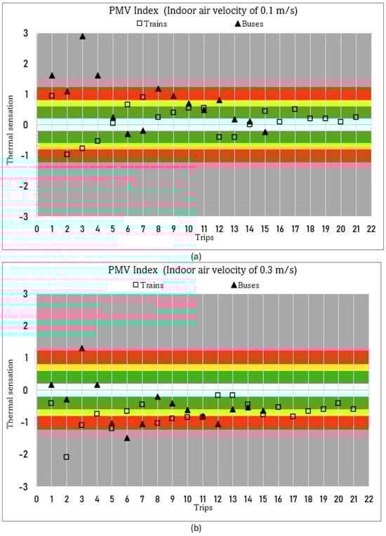 PMV index using two air velocities (a) Va = 0.1 m/s and (b) Va = 0.3 m/s for all the bus and train trips investigated.