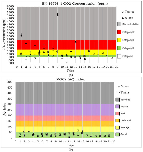 Figure 6a shows the mean and SD values of CO2 concentration on the investigated bus and train trips. By simple descriptive statistics, the mean value of CO2 concentration levels considering all 15 buses is 1848 ppm, which corresponds to category IV of EN16798-1, while for trains, it was 1116 ppm, which corresponds to category II. However, in nine buses, the values of the mean CO2 level were found to have not exceeded category III, while the remaining six buses presented high values of mean CO2 levels in category IV and the discomfort zone. The implication is that only 60% of the investigated buses had suitable mean CO2 levels. For the 21 train trips, the mean CO2 levels (Figure 5a) suggest that IAQ was better as per the CO2 requirements of the referenced standard. The overall situation is that 20 trips were within acceptable levels (categories I, II, and III), while one trip (trip 6) had a mean CO2 level of 1777 ppm. Notably, the mean CO2 levels recorded in all the passenger cabins did not attain nor exceed critical levels of 3000 pm, which can cause adverse symptoms such as fatigue, headaches, visual disturbances, reduced concentration, or poor performance in vehicle drivers [67]. The results of the average value of the time series of the VOCs IAQ index presented graphically in Figure 6b suggest that VOC levels complied with requirements during all train trips investigated. The volatile organic compound (VOC) levels in the 15 bus trips surveyed were also within the acceptable range according to the EN16798-1 requirements. The CO2 and VOC levels suggest that IAQ may be classified qualitatively as good in terms of what concerns these pollutants in the passenger cars of the studied train trips.