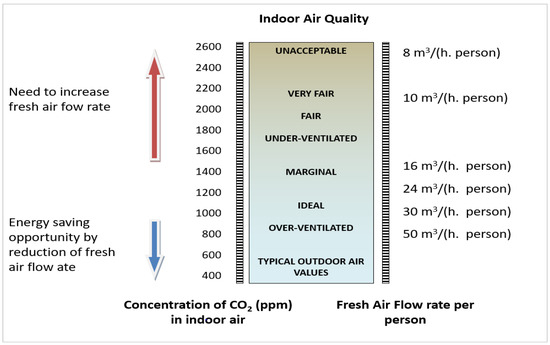 CO2 concentrations and fresh air flow rate correlation with the IAQ conditions [78].