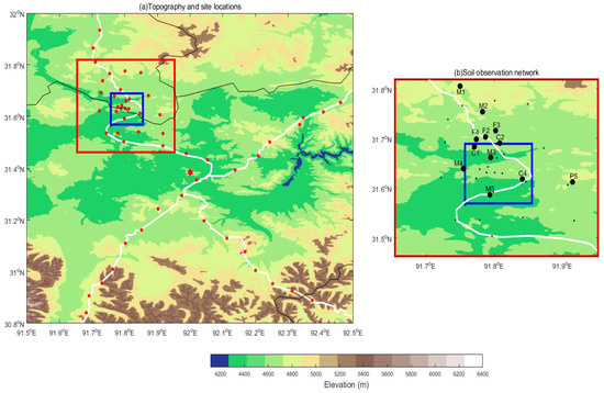 The multi-scale observation network constructed by the Institute of Tibetan Plateau Research, Chinese Academy of Sciences (ITPCAS), comprises 57 stations in the central Tibetan Plateau region adjacent to Nagqu City for measuring the SM and ST at four soil depths, 0–5, 10, 20, and 40 cm. As the highest soil moisture network above sea level in the world (the elevations of these stations vary in the range of 4470~4950 m) (Figure 1a), the experimental area is characterized by a high soil moisture dynamic range and semiarid climate, and the available datasets cover the period from 2008 to 2016 [21,57]. All the sensors of each station were calibrated by taking into account the impact of soil texture and soil organic carbon content on the measurements.