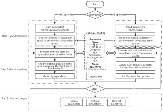Due to the high nonlinearity (i.e., the high-dimensional parameter space and the multi-objective simulations), intelligent evolution considering a stochastic searching strategy based on both population (or global) and individual (or local) evolution was desired to find the global optimal solution, which is also known a the GSA. The GSA of this study, described in Figure 2, used a general framework considering broader flexibility to encourage various global optimizers and/or LSMs updates. It had three sequential modules as follows: Firstly, the optimizer parameter and population were initialized sequentially. Then, global searching that compared the LSM and observations was conducted to find the ongoing mentioned solution with potentially global optima. Finally, the optima were output when the GSA stop criteria were met.