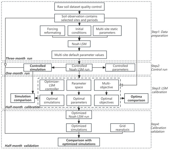 The experimental design is shown in Figure 3, and four steps were conducted as follows. (1) Data preparation: Simple quality control was conducted first for the raw soil observations to ensure that the selected datasets with a four-month-long period were temporally consistent. When preparing the reformatted forcing and the multi-site land static parameters, three-month-long controlled LSM runs were conducted to achieve the multi-site default parameter values. (2) Control run: A one-month-long (the controlled period) run with the default parameter values was conducted to determine the controlled parameters and simulations that can describe the problematical or biased relations between land parameters and soil temperature simulations. (3) LSM calibration: For the first fifteen days of the controlled period, two calibrations (based on PSO and SCE) with the same parameters as the control run were conducted to achieve the multiple optima of the GSA. A comparison of the different optimizers in the multiple optima was conducted to determine the optimizer’s ability to perform soil temperature calibration, and simulation differences among the control run, calibrations, and observations were assessed to determine the overall advantages and weaknesses of the GSA in soil temperature calibration. (4) Calibration validation: For the following fifteen days of the controlled period, two verification simulations with the optimal parameters derived from the calibration runs were conducted to achieve the optimized simulations. The various simulation differences among control run, calibration, and validation were compared to identify the calibration performance on the medium-range soil temperature forecast.