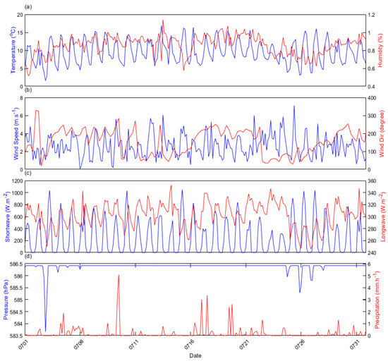 Site−averaged forcing datasets for the study area from 1 July to 31 July 2014: (a) temperature (blue) and humidity (red), (b) wind speed (blue) and wind direction (red), (c) shortwave (blue) and longwave (red) radiation, and (d) pressure (blue) and precipitation (red).