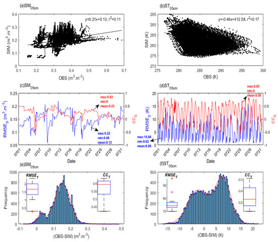 Comparison of CTR simulations and observations of the surface layer for all sites during July 2014. (a,b) Fit between simulations and observations for surface soil moisture and temperature, respectively. (c,d) Spatial difference (RMSES, blue line; CCS, red line) versus time for surface soil moisture and temperature, respectively. Statistics for RMSES and absolute CCS are also shown. (e,f) Gaussian histogram fits (bar, frequency; red line, best fit; RMSET and CCT among all sites are shown in the box plot) for errors between simulations and observations of surface soil moisture and temperature, respectively.