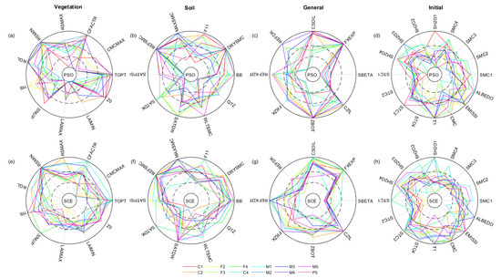 The optimal vegetation (a), soil (b), general (c), and initial (d) land surface parameters of the twelve sites for the PSO optimizer. (e–h) are the same as (a–d), but for the SCE optimizer. The two dashed circles represent the reference limits of 0.33 (inner) and 0.67 (outer) in the parameter space.
