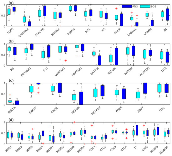 Moreover, the optimal parameter ranges and outliers against sites between PSO and SCE are shown in Figure 7. For the “Vegetation” type, except the CFACTR, SNUP, LAIMIN, and Z0 parameters, all other PSO optimal parameters have smaller ranges than SCE. For the “Soil” and “General” types, except WLTSMC and FXEXP, all the other SCE optimal parameters have smaller ranges than PSO. Meanwhile, for the “Initial” type, except SH2O2 and SH2O3, all the other SCE optimal parameters also have smaller ranges than PSO. Thus, except for the “Vegetation” type, most of the optimal parameters for PSO exhibited more spatial differences than those for SCE. Nevertheless, the optimal parameters of the “Initial” type for SCE have more outliers than PSO. This indicates that SCE achieved small ranges for the “Soil” and “General” types, but possibly at the cost of large “Vegetation” uncertainties and more unaccountable initial parameters.