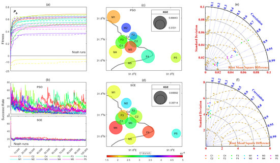 The calibration efficiency of this work was defined as the fitness values (or the best population location, Pb) against the number of LSM runs (or the convergence speed). Better fitness values (i.e., larger KGE values) with fewer LSM runs indicated more efficiency. However, because it was often not possible to have both because of the physical constraints of the LSM parameters, the success rate (i.e., the ratio between the constrained individual numbers and the population size during one generation) was usually assessed at the same time to explain this during the calibration comparison. A larger success rate indicated eliminating more individuals, or a larger searching domain, with stronger evolution ability.
