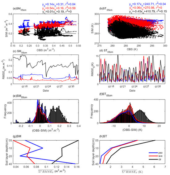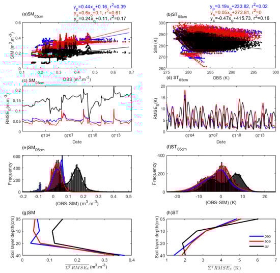 The CTR simulations and OBS for the surface layer are compared in Figure 5. The linear fit for SM exhibited a small increasing slope (about 0.21) with weak consistency, and ST had a larger decreasing slope (about −0.46) with strong differences (Figure 5a). The spatial root-mean-square error (RMSES) for soil moisture was generally around 0.15 m3 m−3 and it increased slowly with time. The CCS decreased with time, and the RMSES and CCS for soil temperature exhibited diurnal differences. The Gaussian histogram fits for the errors of SM and ST had bimodal distributions, where the RMSES and CCS for soil moisture were about 0.17 m3 m−3 and 0.58, respectively, and the RMSES for the soil temperature was quite large and the CCS was even negative.