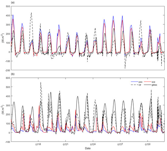 Note that the validation results were highly consistent with the soil moisture reanalysis at 3 h and 0.25° scales for GLDAS and 1 h and 0.1° scales for ERA5, but opposite variations in the soil temperature were observed between the reanalysis results and observations (Figure 11); also, the sensible heat fluxes were highly consistent but the latent heat fluxes were underestimated using the calibration methods compared with GLDAS (Figure 12). As the differences in the latent heat fluxes over dry surfaces should be measured by using more reliable flux observations [4], these datasets’ inconsistencies can be mostly attributed to the ST modeling deficits [21,57,58,59,60,61].