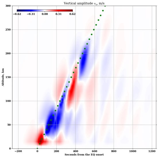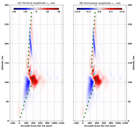 Figure 2A,B demonstrate the AGWs’ propagation above the epicenter. We note that from the ground uplift, numerous waves with wavefronts of different slopes or phase speeds propagate into the atmosphere. Waves with significant amplitudes of about 10–20 m/s arrive at thermospheric altitudes of about 150 km about 250–300 s from the earthquake’s onset.