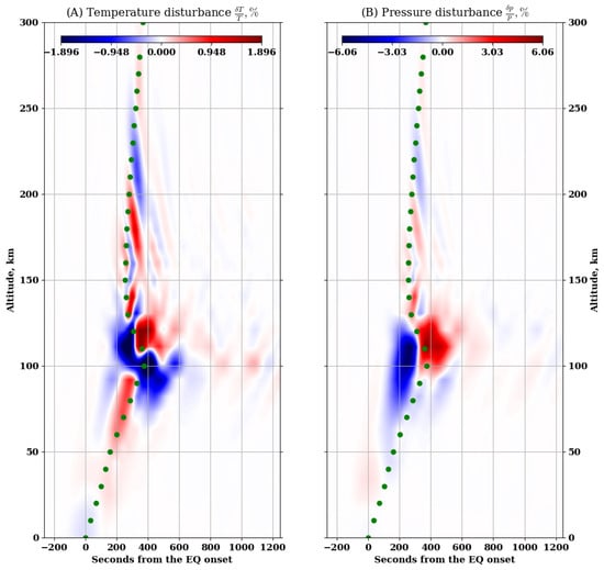 Figure 3A,B demonstrate the co-seismic temperature and pressure disturbance energetics above the epicenter. We note that these co-seismic atmospheric disturbances attain a significant amplitude above 100 km altitude, i.e., co-seismic thermospheric disturbances (CSTDs) acquire large amplitudes among atmospheric disturbances. The CSTDs gain significant amplitudes in 250–300 s from the earthquake’s onset time.