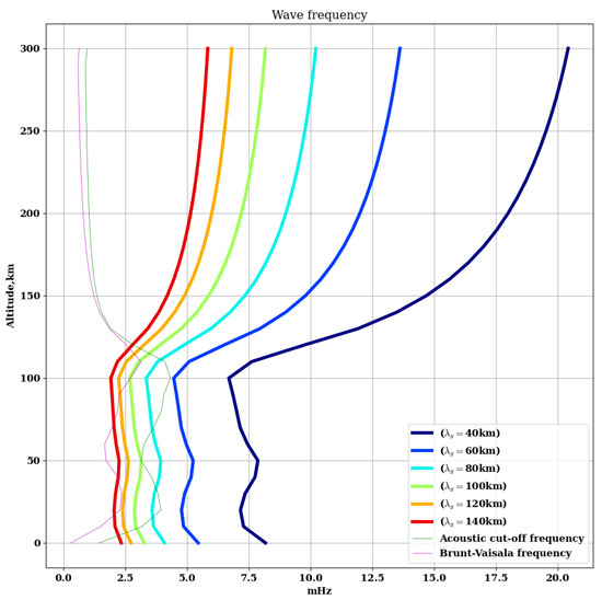 The altitude variation of wave frequency as derived from the dispersion relation (5). The thin fuchsia and green curves represent the Brunt–Vaisala frequency and acoustic cut-off, respectively. The other curves represent the frequencies of the Acoustic-gravity waves (AGWs) with different wavelengths.