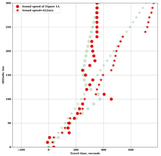 Results from ray-tracing simulation. The green circles represent travel time with the average sound speed (c = 422 m/s), where the average is between 0 and 200 km altitude.