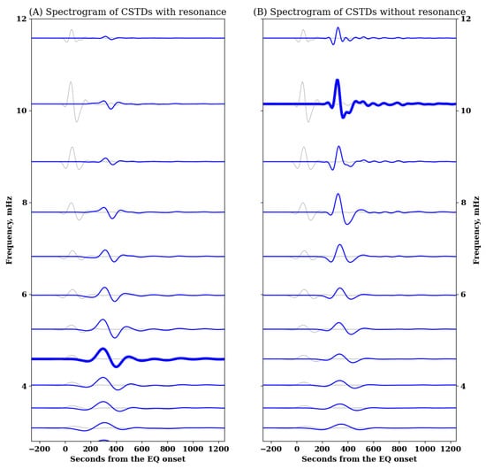 Spectrograms of integrated CSTDs with and without the resonance energetics: (A) CSTDs corresponding to the pressure disturbance, from the original simulation, as demonstrated in Figure 3B. (B) CSTDs corresponding to the pressure disturbance resulting from a simulation run that excludes vertical wavelengths longer than 70 km. The integration is in the 150 to 250 km altitude range. Thick curves correspond to the strongest CSTDs, and the grey curve corresponds to the spectrogram of ground uplift.