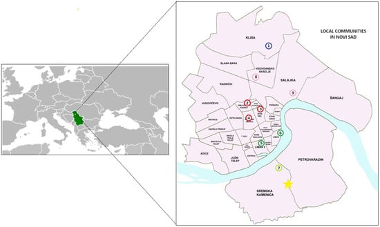 The network of stations for collecting data on meteorological factors and air pollution inside the local communities of the City of Novi Sad. Legend: meteorological station (marked in blue circle): 1 (45°20′ N, 19°51′ E); air pollution stations: detecting urban traffic air pollution (marked in red circles)—2 (45°15′ N, 19°49′ E), 3 (45°25′ N, 19°83′ E), and 4 (45°24′ N, 19°81′ E); detecting urban background air pollution (marked in green circles)—5 (45°14′ N, 19°50′ E) and 6 (45°25′ N, 19°85′ E); detecting suburban background air pollution (marked in light-green circle)—7 (45°13′ N, 19°50′ E); detecting suburban industrial air pollution (marked in pink circle)—8 (45°16′ N, 19°52′ E) and 9 (45°29′ N, 19°78′ E); yellow star—localization of the Institute for the Pulmonary Diseases of Vojvodina (45°21′ N, 19°85′ E).