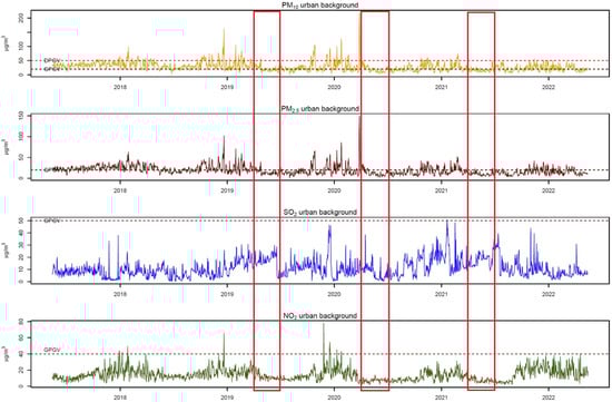 Time series of average daily concentrations of the examined air pollutants in the urban background environment. Legend: red frame—refers to time period of March–June of appropriate year; DPGV—red dashed line indicates the recommended daily concentrations of air pollutants according to Directive 2008/50/EC and the legal acts of the Republic of Serbia; GPGV—dark red dashed line indicates the recommended annual concentrations of air pollutants according to Directive 2008/50/EC and the legal acts of the Republic of Serbia.