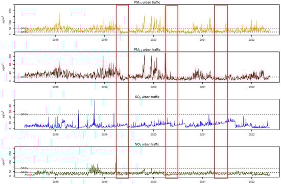 Time series of average daily concentrations of the examined air pollutants in the urban traffic environment. Legend: red frame—refers to time period of March–June of appropriate year; DPGV—red dashed line indicates the recommended daily concentrations of air pollutants according to Directive 2008/50/EC and the legal acts of the Republic of Serbia; GPGV—dark red dashed line indicates the recommended annual concentrations of air pollutants according to Directive 2008/50/EC and the legal acts of the Republic of Serbia.