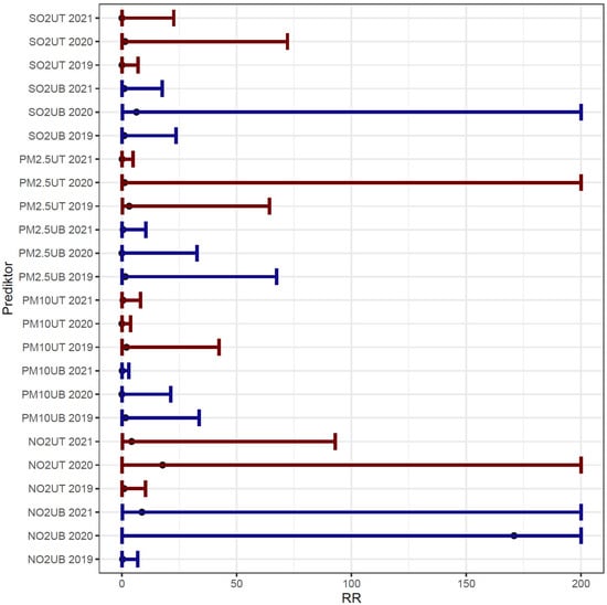 Using DLNM, the RR for AECOPD hospitalization of non-infectious etiology was then calculated for each 10 μg/m3 increase in the air pollutant concentration between March and June of 2019, 2020, and 2021. The results are displayed in Figure 4. For two RRs to be statistically significantly different, their 95% CI must not intersect. As shown in Figure 4, all 95% CIs overlap, which indicates that RRs during the three observed periods did not differ statistically significantly, meaning that exposure to air pollution during the lockdown period did not have a statistically significant effect on the change in the number of AECOPD hospitalizations compared to the same period in 2019 and 2021. The illustration pertaining to SO2(UT) demonstrates that for each 10 μg/m3 increase during March–June 2019, the RR for AECOPD hospitalization of non-infectious etiology was 0.05 (95% CI 0.00–7.03), whereas for the same period in 2020, the RR was 1.41 (95% CI 0.03–72.12). Although the calculated RR values are different, the 95% CIs overlap, indicating that there were no statistically significant differences between the effects of SO2(UT) during these two time periods on the incidence of AECOPD hospitalizations.