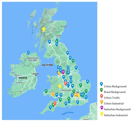 - Department for Environment Food and Rural Affairs. Site Environment Types. Available online: https://uk-air.defra.gov.uk/networks/site-types (accessed on 24 April 2024).