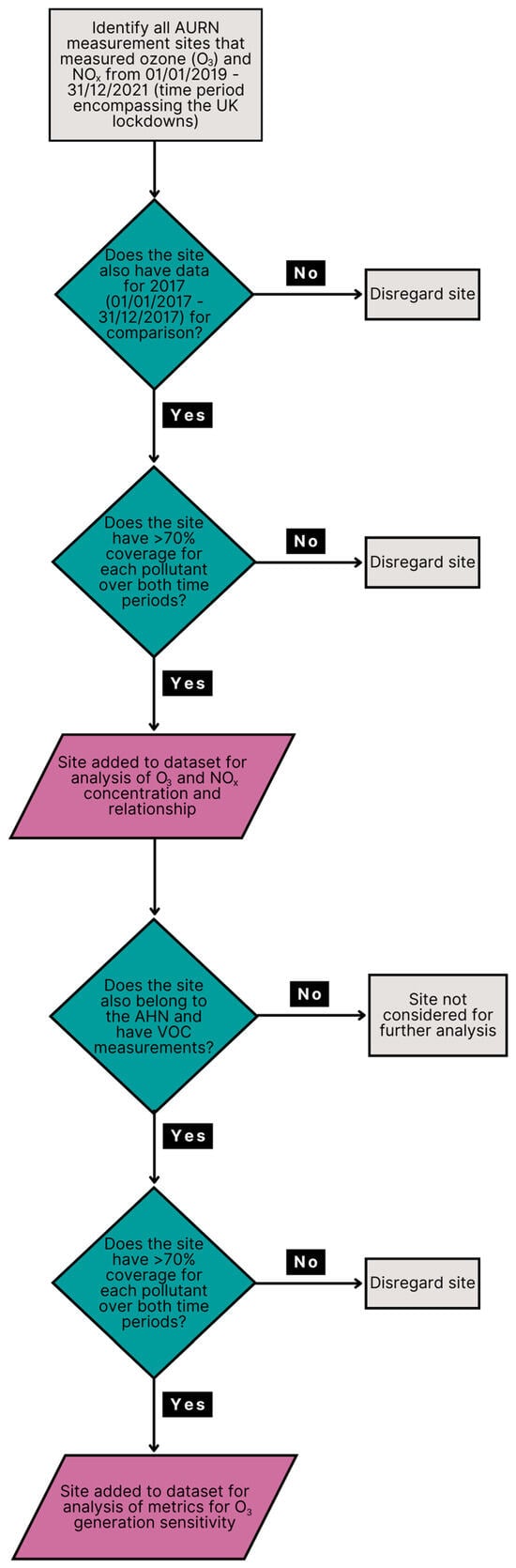 A reasonable availability of NOx and O3 data across the UK AQMS can give an extensive analysis of ozone’s response to changes in NOx concentrations. However, the study of the analysis of ozone sensitivity changes with VOCs is limited due to insubstantial quantities of VOC data, which are only available at three of the four automatic hydrocarbon network sites. These sites, in turn, represent only 4 of the 170 total AQMSs and only three of the six different environment types. The sites with specific environments also had limited data, with suburban industrial, suburban background, urban industrial and urban traffic lacking substantial data and representing only one, three, three, and three sites, respectively.