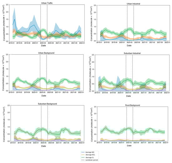 Averaged monthly concentrations of NO, NO2 and O3, January 2019–December 2021 for all sites analysed, averaged by their environment type, with standard deviation represented using continuous, translucent error bars and hashed black lines indicating the first lockdown in 2020 (23 March–4 July).
