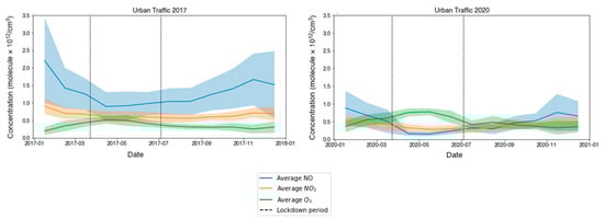 Average monthly concentrations of NO, NO2 and O3 from the urban traffic sites over 2017 and 2020, represented using continuous, translucent error bars and hashed black lines indicating the lockdown period in 2020 as well as the same time period in 2017, in which there was no lockdown, for comparison.