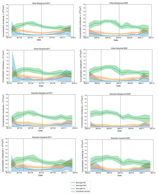 Average monthly concentrations of NO, NO2 and O3 for the urban background, urban industrial, suburban background and suburban industrial sites over 2017 and 2020. Standard deviation is represented using continuous, translucent error bars and hashed black lines indicate the lockdown period in 2020 as well as the same time period in 2017, in which there was no lockdown.