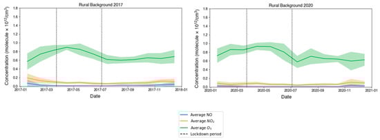 NOx-limited O3 generation regimes were also expected in rural areas due to low NOx concentrations. This is supported by analysis utilising sensitivity indicators. For 2017, the rural background site (CO) displays [VOC]/[NOx] values of ~20–40 in agreement with the current literature [,]. In 2020, a considerable increase in [VOC]/[NOx] ratio is seen with values ~30–65 indicating O3 formation was particularly sensitive to NOx concentrations during the lockdowns. Comparison between these years demonstrates the consistency of rural background sites; at these sites, the best way to control O3 pollution is reduction of NOx.