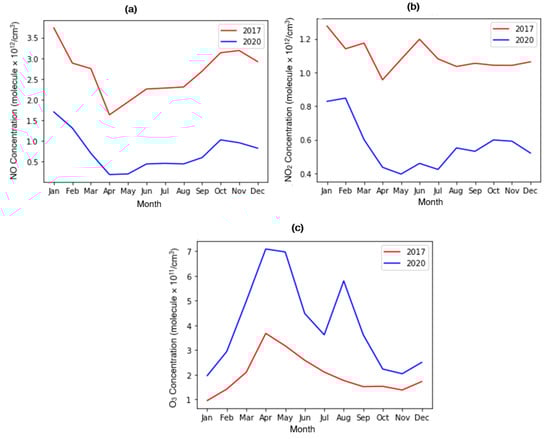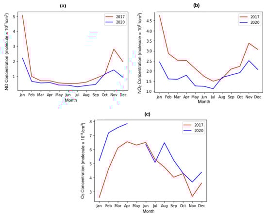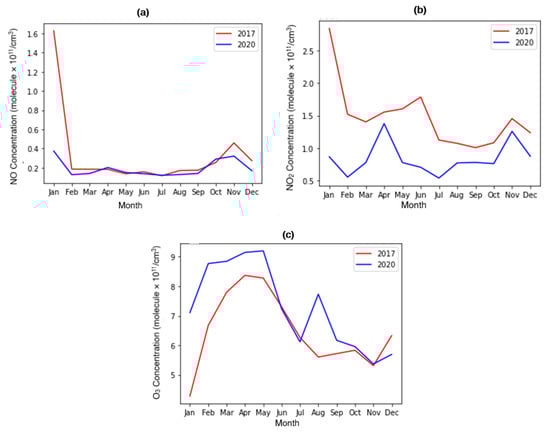 Time series plots of monthly averaged concentrations for (a) NO, (b) NO2 and (c) O3 at the London Marylebone Road (LMR) air quality monitoring station, for the years 2017 and 2020.